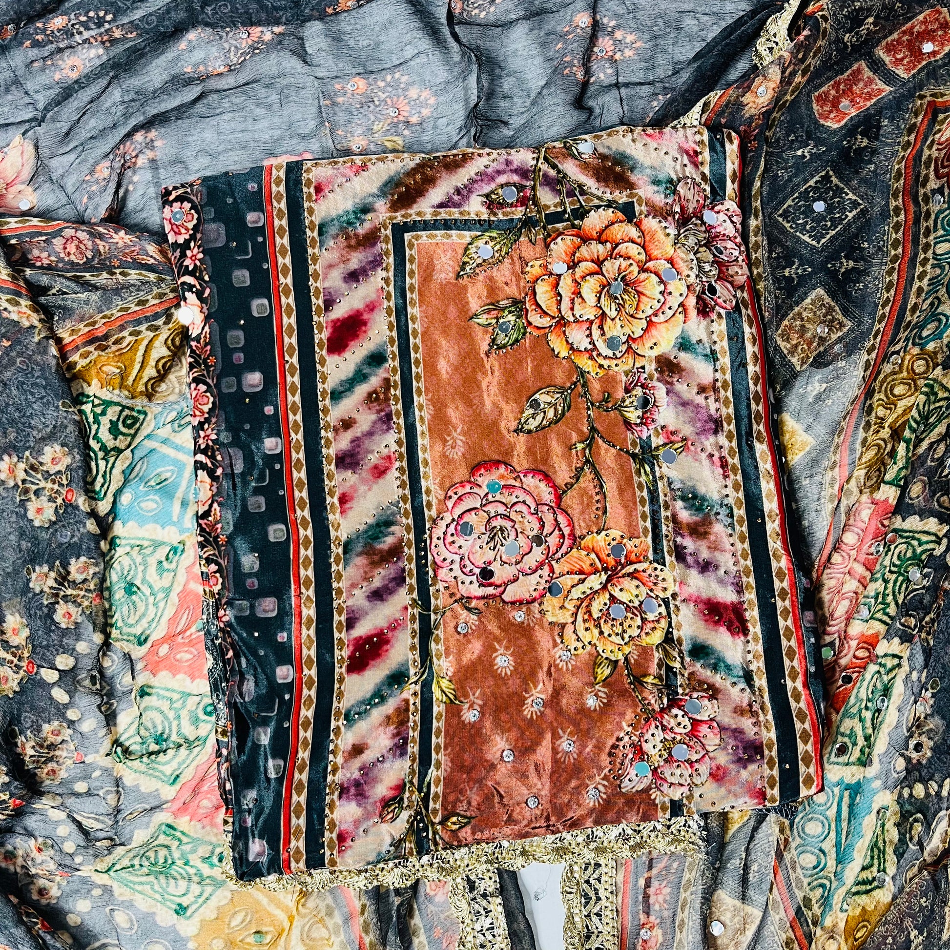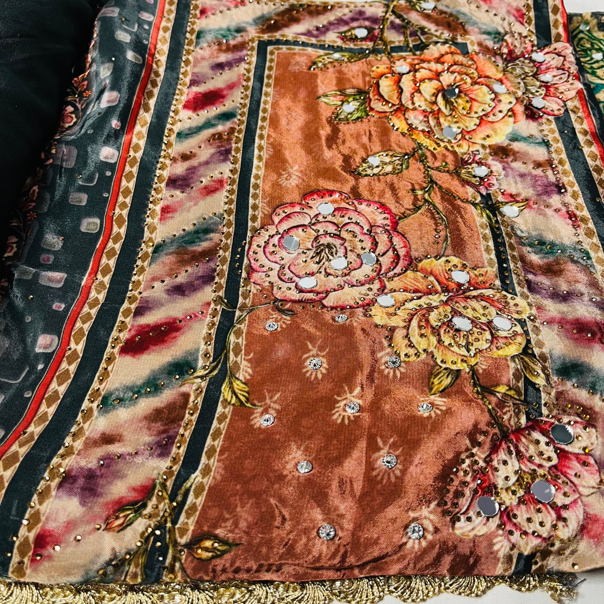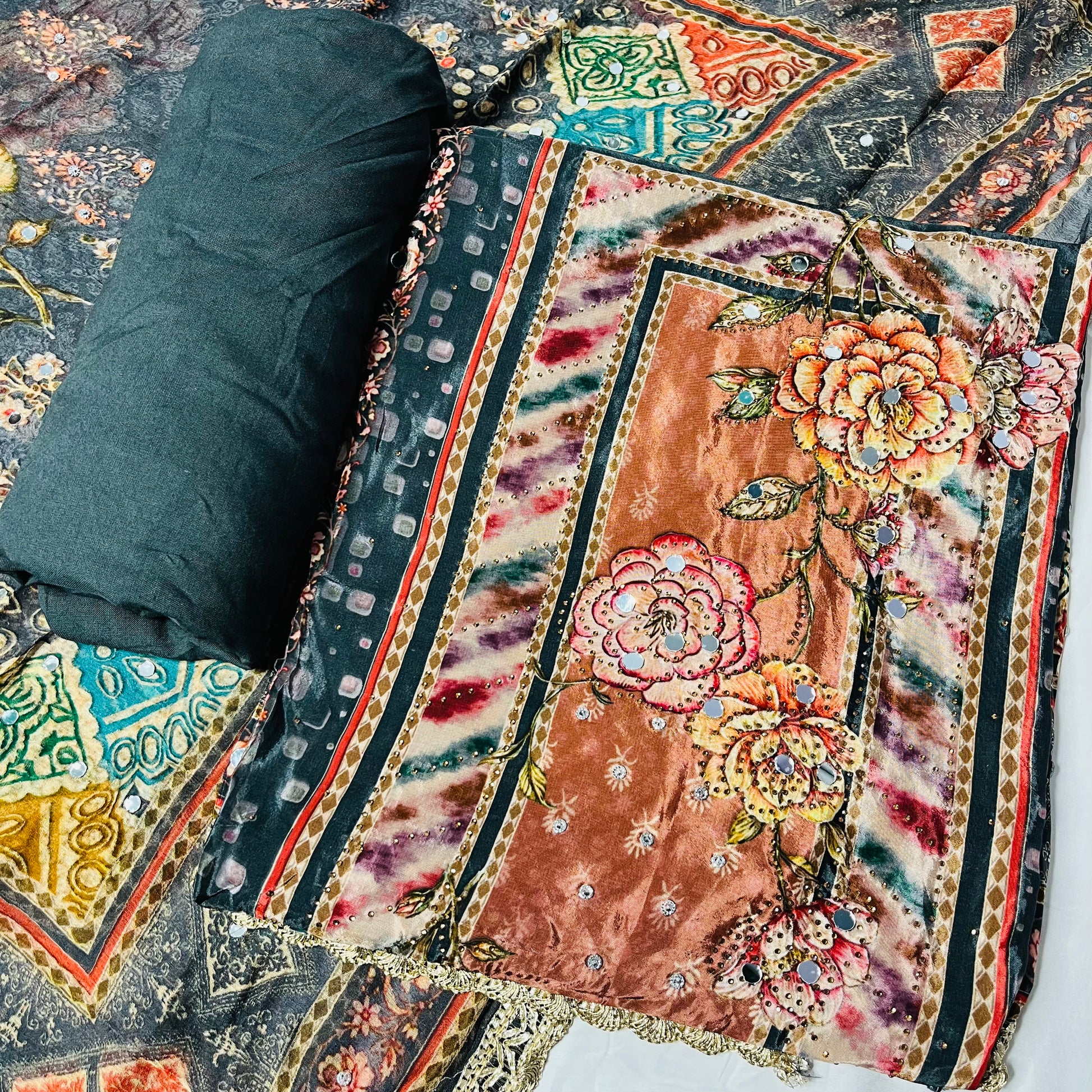 Elevate your festive style with this Rust & Black Pure Natural Crepe Salwar Suit. The striking rust shade on the top, paired with a deep black bottom, creates a sophisticated and bold contrast. Adorned with vibrant floral motifs and intricate detailing, this unstitched 3-piece suit is perfect for weddings, parties, and special gatherings. Crafted from pure natural crepe, it offers a luxurious drape and all-day comfort.